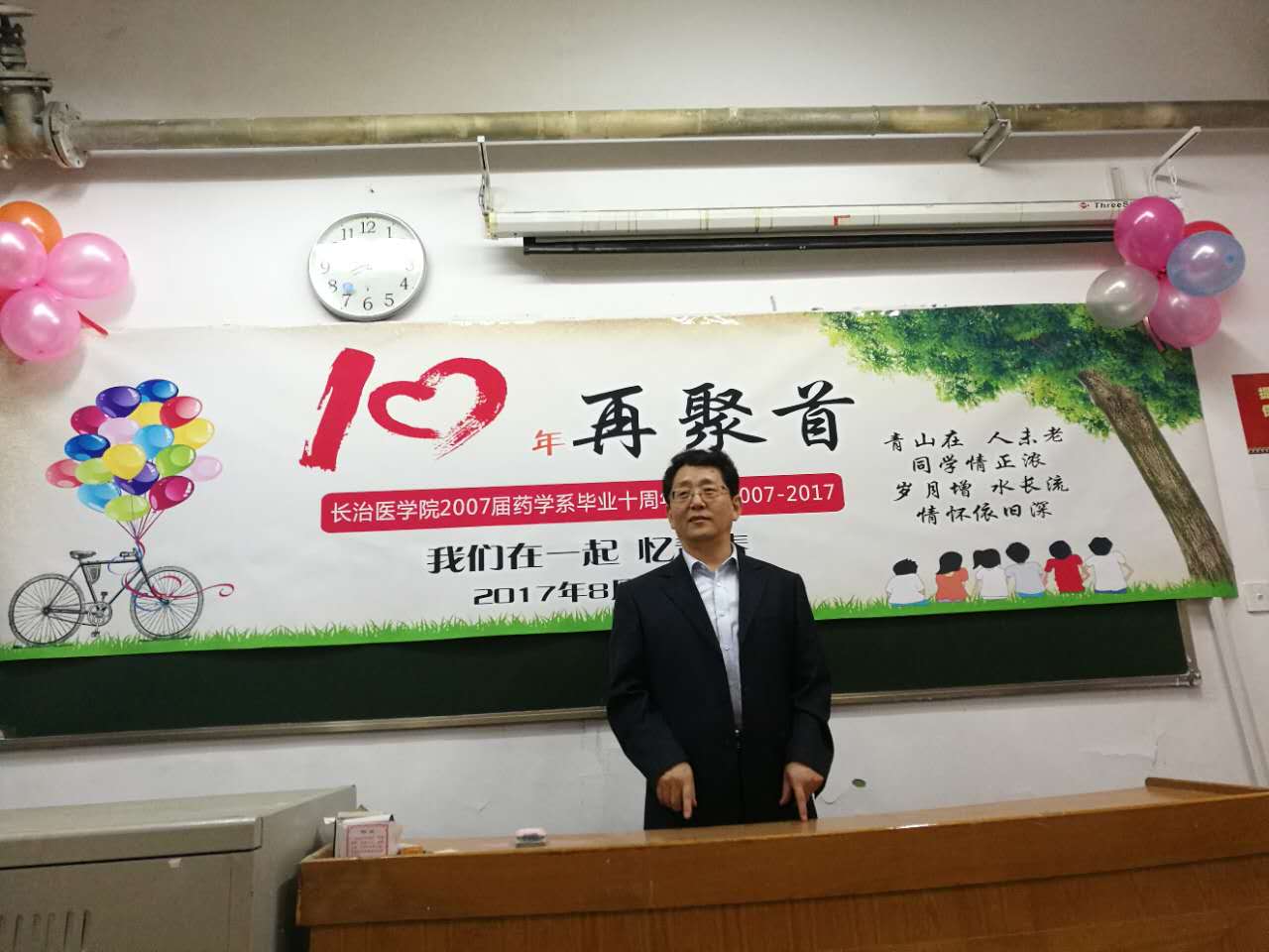 8月26日上午,药学系2007届毕业生相聚母校合影留念,学院副院长宋晓亮、原药学系副主任郑王巧以及部分教师参加了此次聚会。合影之后,大家来到了44教,在这里他们度过了生命中最重要最美好的四年时光。在教室里,学子们再一次坐在了自己曾经熟悉无比的座位上,聆听了宋晓亮副院长的讲话。宋晓亮副院长向大家介绍了药学系开拓、发展、壮大的历程以及目前在教学、科研方面取得的一系列成绩,表达了对学子们相聚母校的热烈欢迎,真诚地希望同学们以自己毕业十年的经历对药学系的培养方案、课程设置等方面提出意见和建议,最后亲切地祝福大家在今后的人生旅途中家庭幸福!事业辉煌!讲话结束后,2007届毕业生代表刘旺向系里赠送药典一套。