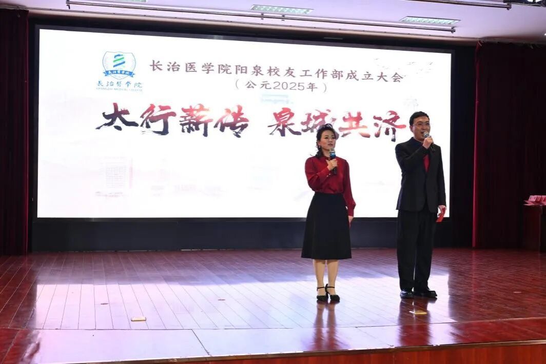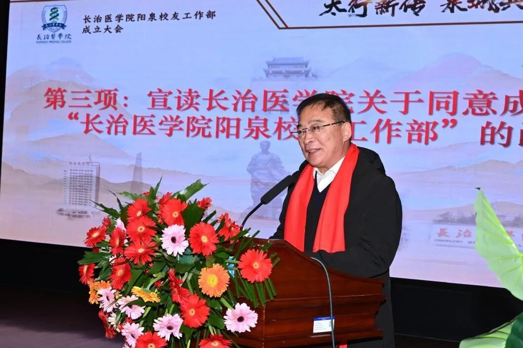 12月28日下午,长治医学院阳泉校友工作部成立大会在阳泉市第一人民医院举行。长治医学院党委副书记、校长王旭,党委(校长)办公室主任邢育宏,护理学院党委书记郭小燕、原党委书记石虹、副书记谢冰出席成立大会。阳泉市第一人民医院党委书记陈魁胜、院长马迎光,通用环球华阳山西健康产业有限公司董事长贾志文,我校95级校友、阳泉市疾病预防控制中心主任尹亮,93级校友、阳泉市妇幼保健院院长张会青,2001级校友、阳泉市中医院副院长潘盂泉,93级校友、阳泉市第四人民医院副院长杨秀慧,99级校友、阳泉市平定县人民医院副院长苗庆林,阳泉市职业技术学院副院长王海平,阳泉市职业中专学校校长杨绪仁,阳泉市师范高等专科学校特教系书记樊卫生和我校西安校友工作部名誉部长韩霜、部长田俊斌,北京校友工作部秘书长牛天亮,太原校友工作部副部长刘建云,忻州校友代表张璇、姜芳、赵镇山,朔州校友代表王成武、李继平以及阳泉校友代表共150余人参加成立大会。