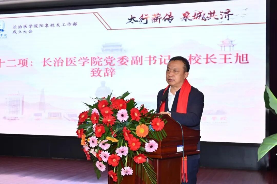 王旭代表学校向阳泉校友工作部成立致以热烈的祝贺;与在场校友分享学校近年来在学科专业建设、人才培养、科技创新、社会服务、校园建设等领域取得的累累硕果。王旭向阳泉校友工作部提出三点希望:一是结牢“情感联结”纽带,以情感为桥梁,以服务为抓手,让校友与校友、校友与母校的联系愈发紧密;二是汇聚“事业共创”合力,当好校友的“资源路由器”,促进校友们在事业上相互支持、在专业上交流互鉴、在合作上互利共赢;三是搭建“协同发展”平台,促进校友资源共享,增强校友凝聚力、发挥校友创造力,实现校友与母校的互利共赢、共享发展。